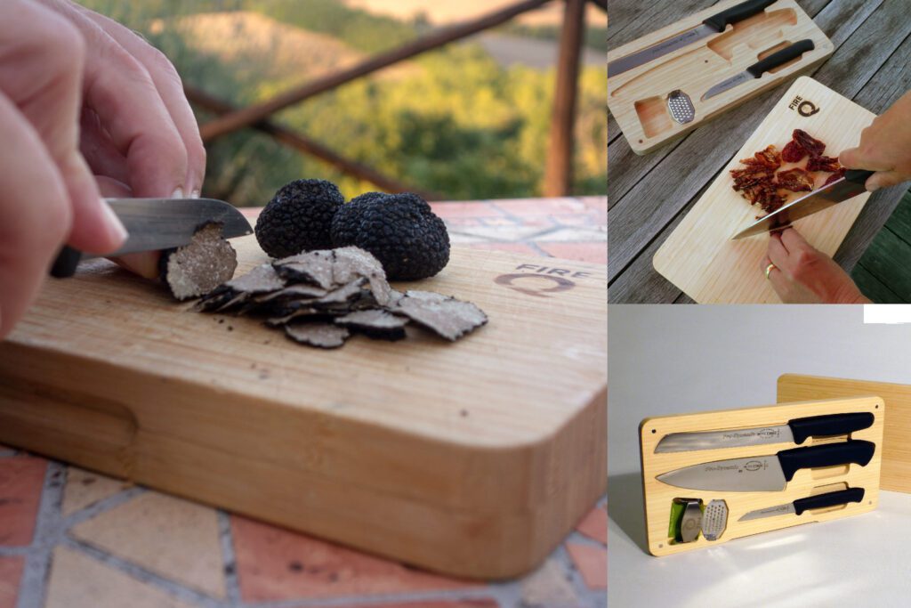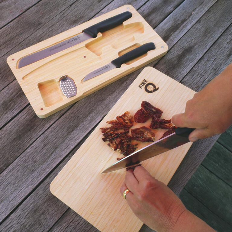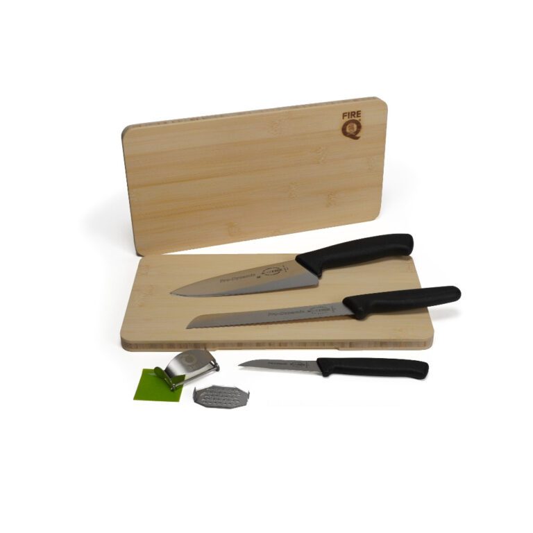 Das FireQ Messerset bietet drei Profi-Küchenmesser von F. Dick, sicher und kompakt zwischen zwei Bambus-Schneidebrettern verpackt. Ideal für unterwegs, ermöglicht es sicheres und hochwertiges Kochen an jedem Ort.