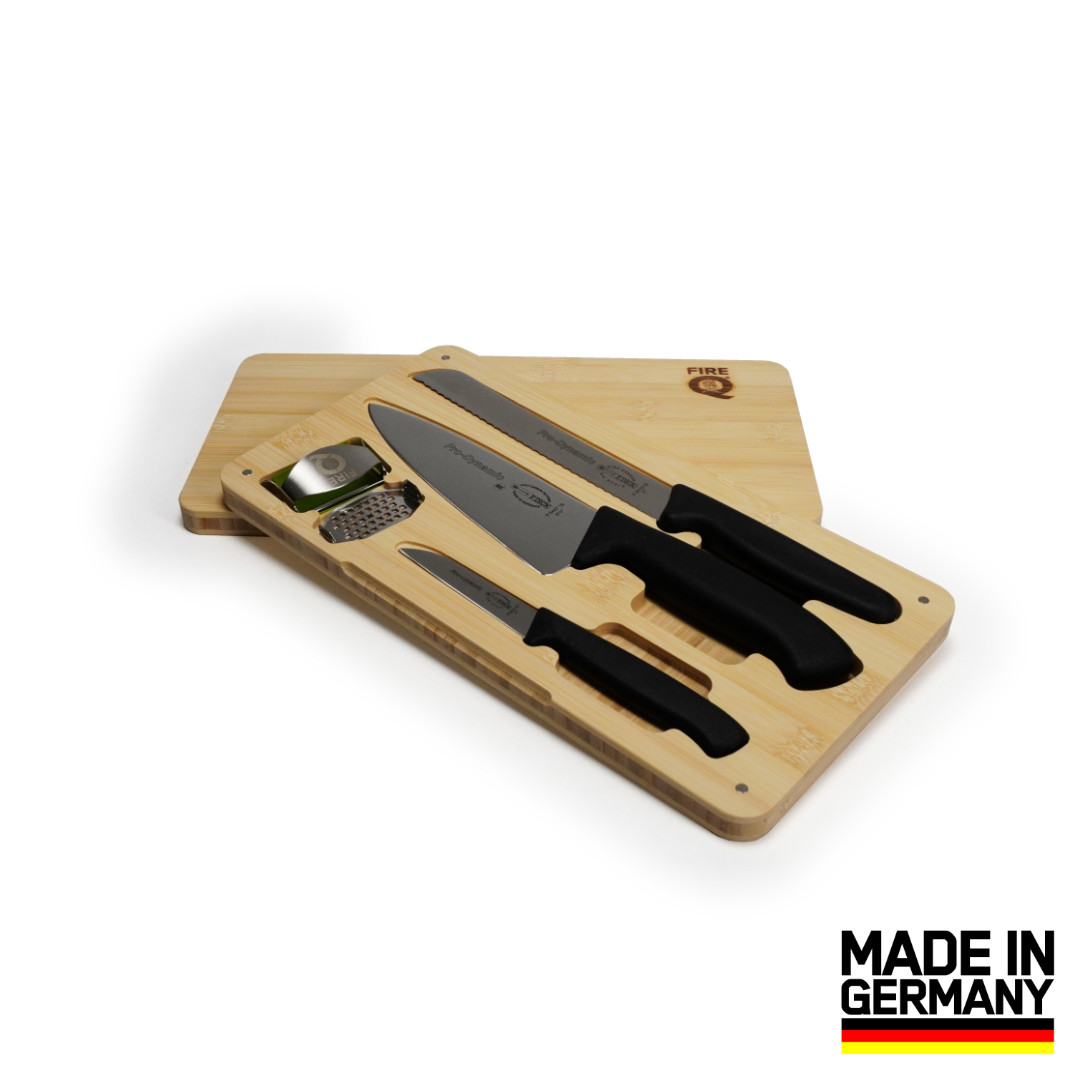 Messerset und 2 Schneidbretter in Einem. Mit dem FireQ-Messerset bieten wir wieder mal eine ganze Menge praktischer Features in einem Produkt: Zunächst 3 Messer in Profiqualität von dem deutschen Traditionshersteller “F.Dick” aus Esslingen, ein Brotmesser mit Wellenschliff (Klingenlänge 18cm), ein großes Kochmesser (Klingenlänge 16cm) und ein Küchenmesser (Klingenlänge 8,5cm), dazu ein Universalschäler mit auswechselbarer Parmesanreibeklinge von dem schweizer Hersteller “Peel Appeal”.