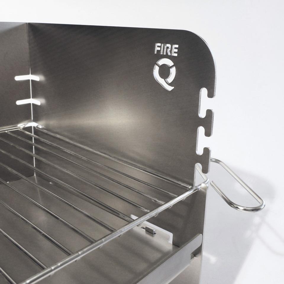 Ohne den Grillrost wird der FireQ Mini zu einer praktischen Feuerstelle. Trockene Äste und Kleinholz können darin sicher und effizient verbrannt werden. Die Seitenteile reflektieren die Wärmestrahlung zur offenen Seite, sodass Du gemütliche Abende am Lagerfeuer genießen kannst.