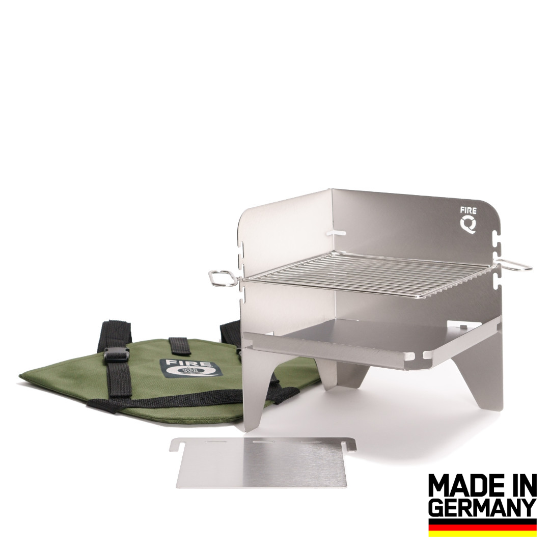 Der FireQ Mini Reisegrill ist der ideale Begleiter für alle, die unterwegs nicht auf Qualität und Komfort verzichten möchten. Zu 100 % „Made in Germany“ wird der FireQ Mini vollständig aus Edelstahl gefertigt – einschließlich des elektropolierten Grillrosts, der besonders leicht zu reinigen ist.
