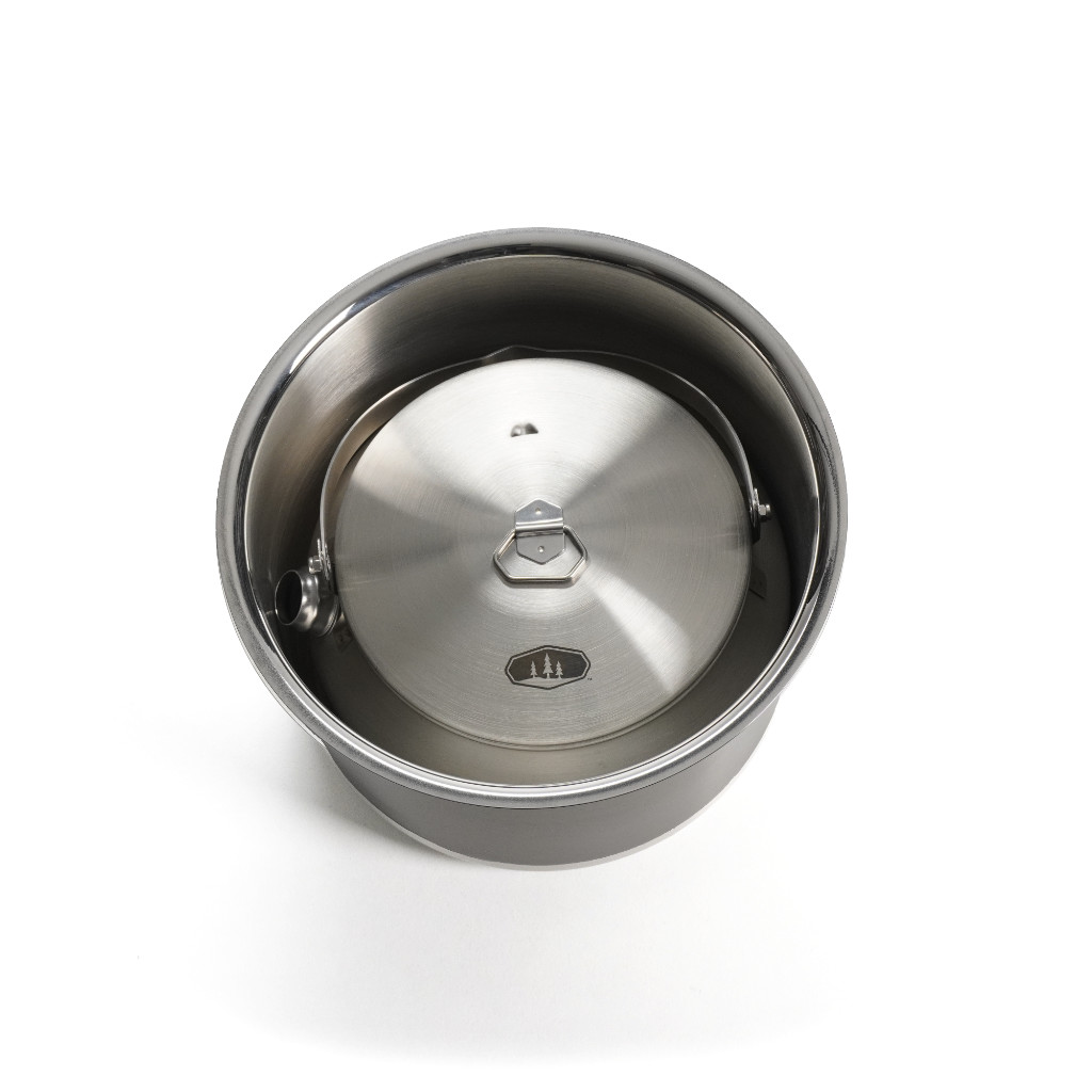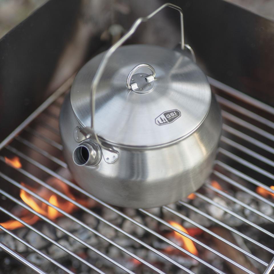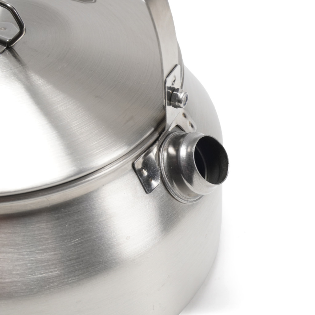 Leichter Edelstahlkessel, 950ml Inhalt mit Deckel. Besonders erwähnenswert ist die tropffreie Schnaupe. Zudem rastet der Henkel in der senkrechten Position ein, so dass er sich nicht allzu stark erhitzt. Der Kessel ist auch für das Erwärmen von Wasser auf dem Holzkohlegrill oder über offenem Feuer geeignet.